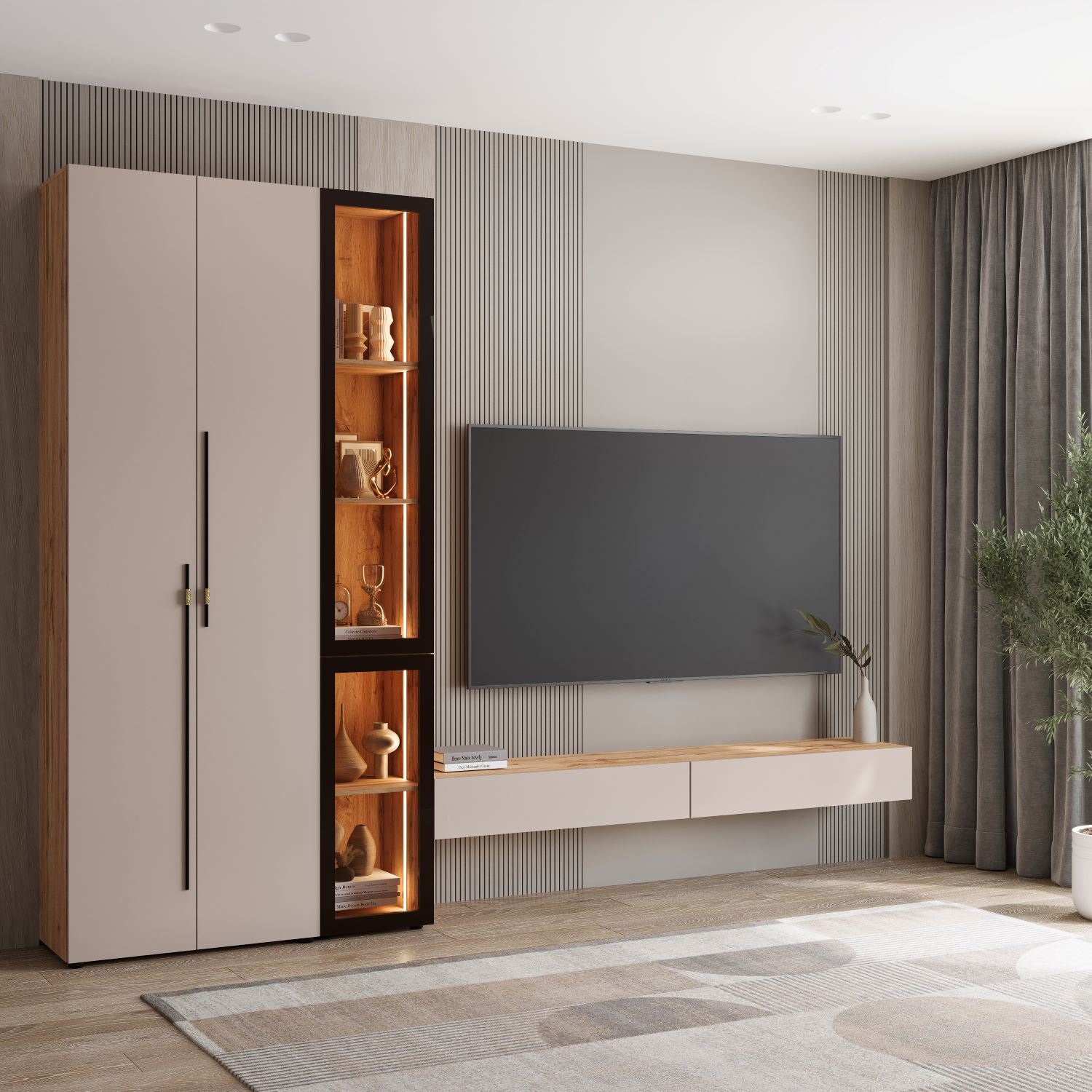 После этого определиться, что конкретно необходимо именно Вам - ниша под ТВ, шкафы, пеналы, витрины, тумбы. Что из этих элементов Вы хотите видеть в составе стенки.