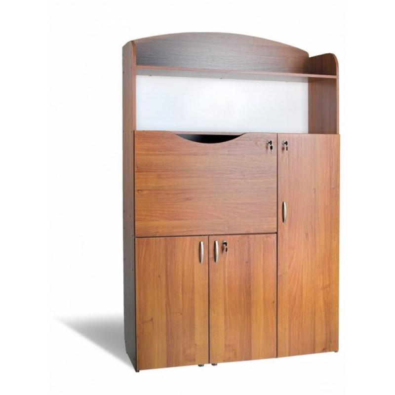 Компьютерный стол-бюро Б-4 Престиж производителя Тиса-мебель условно можно разделить на три зоны. Нижняя зона с двухстворчатой дверью предназначена для системного блока. Верхняя зона имеет откидную дверь, которая служит столешницей стола. Внутри есть полка под монитор. Справа предусмотрен пенал с двумя выдвижными ящиками и полками для документов, книг, канцтоваров. Стол-бюро Б4 - это идеальный вариант для подростка, школьника, ведь занимает немного места, при этом достаточно функциональная и практичная модель.
