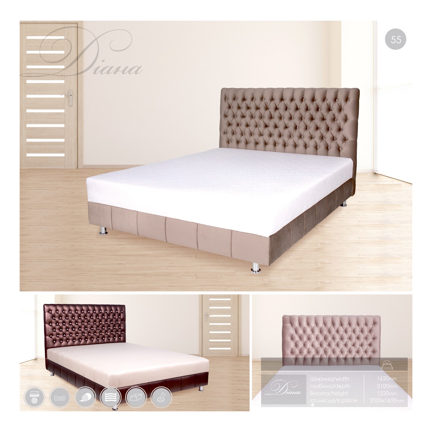 Кровать Диана обладает необычным дизайном и и максимальным уровнем комфорта! Кровать имеет множество вариантов обивочной ткани и множество возможных расцветок, поэтому Вы можете подобрать кровать под любой интерьер.Мягкое высокое изголовье с пуговицами, выполненное по методу "каретной стяжки", отсутствие изножья делают эту кровать безупречной для спальни!