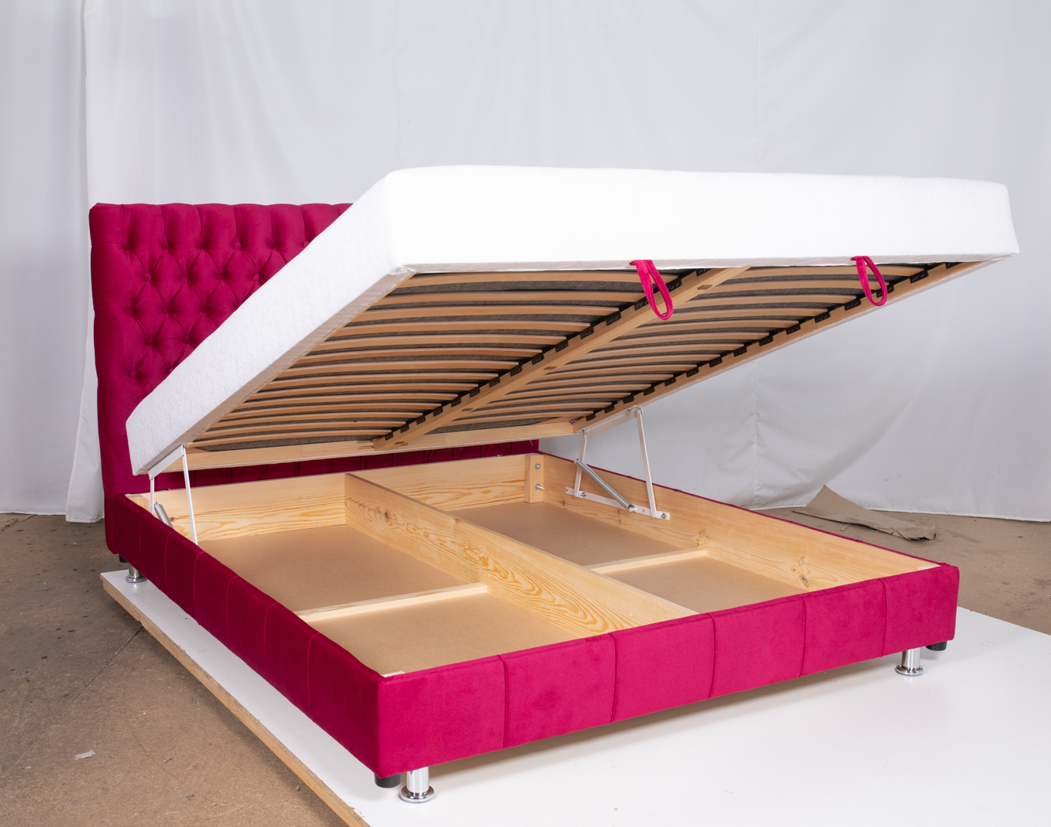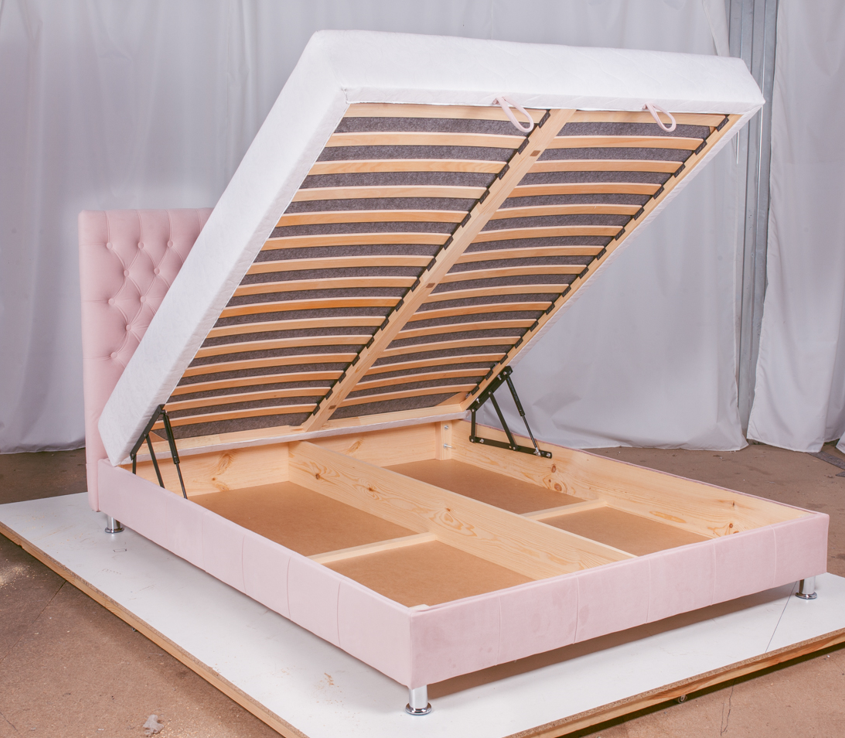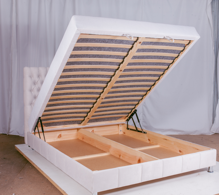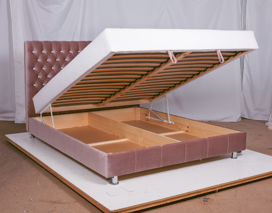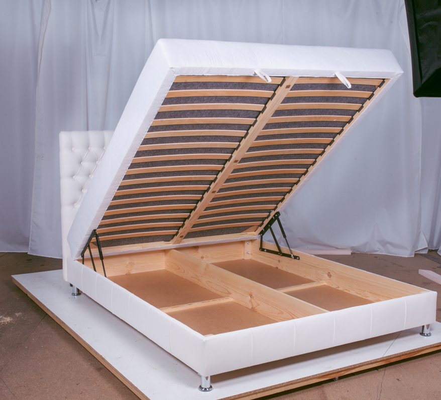 Кровать Диана №3 комплектуется подъемным каркасом под матрас с буковыми ламельным. Газовые подъемники. Ящик для белья.