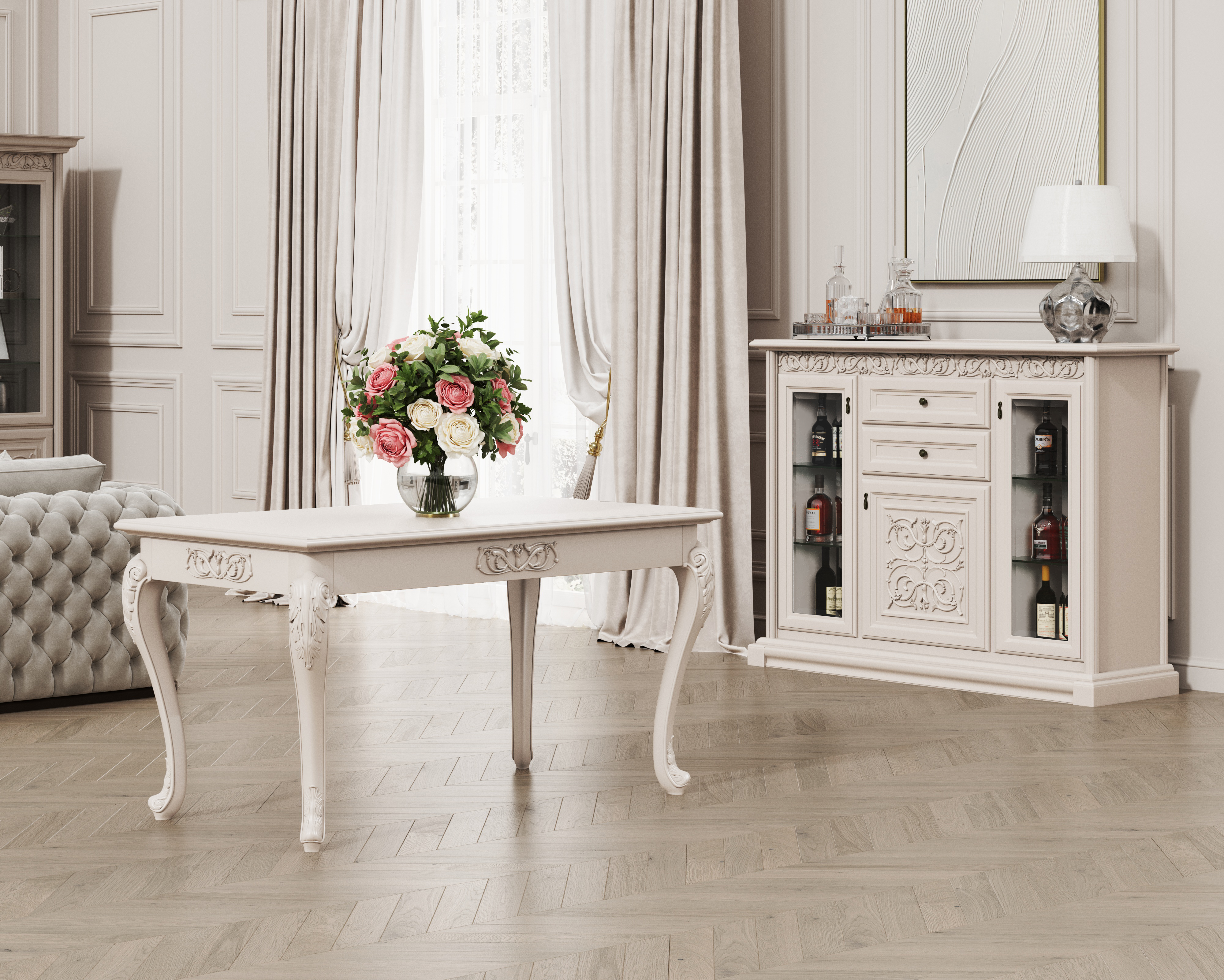 Комплект мебели «Лацио» включает в себя шкаф для одежды в двух размерах, кровать односпальную и двуспальную, комод, один из которых с витражными дверками из стекла. Завершит образ спальни прикроватная тумбочка, которая имеет не только выдвижной ящик, а и открытую полочку. В гостиную можно подобрать витрину двух вариантов, журнальный столик с изящными резными ножками, надставку на тумбочку. Комбинируя элементы комплекта можно создать идеальный вариант, который Вам подойдет с учетом габаритов комнаты и пожеланий. Вся мебель модульной системы «Лацио» декорирована резными элементами, которые свойственны классическому стилю.