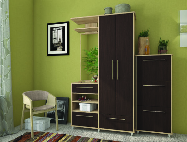 На выбор предлагаются два цветных сочетание «дуб Сонома» / «венге магия» и «дуб Сонома» / «белый». Прихожая укомплектован выдвижным ящиком, высокой шкафом, полкой и крепким вешалкой, а также вместительной тумбой для обуви.