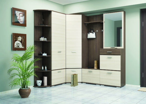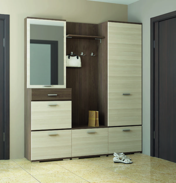 В комплект модулей Вива входят: большой шкаф, полки и несколько вместительных тумб, зеркало с правильной формой. Шкаф дополнена выдвижной вешалкой и внутренней полкой. Завершают композицию прочные металлические крючки.