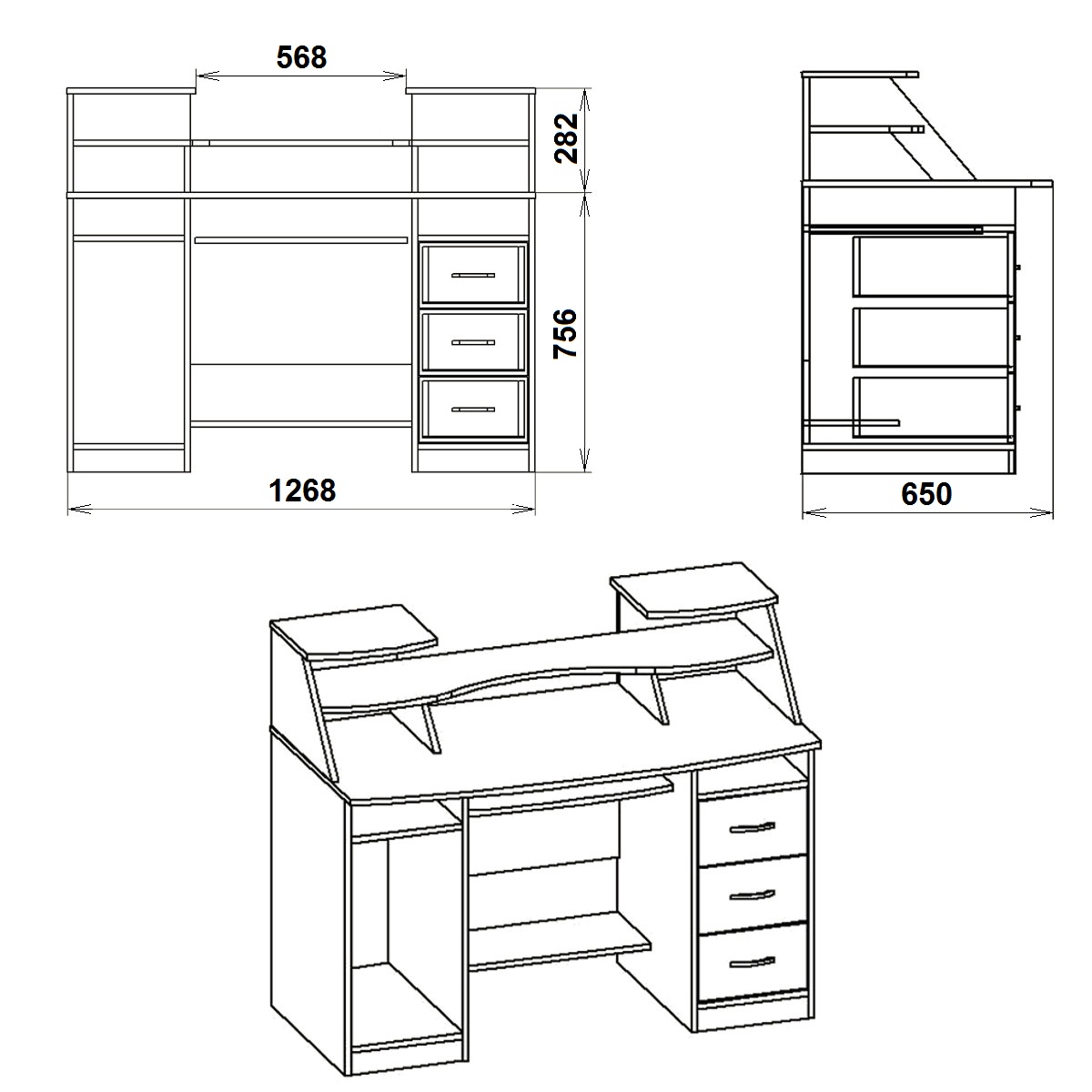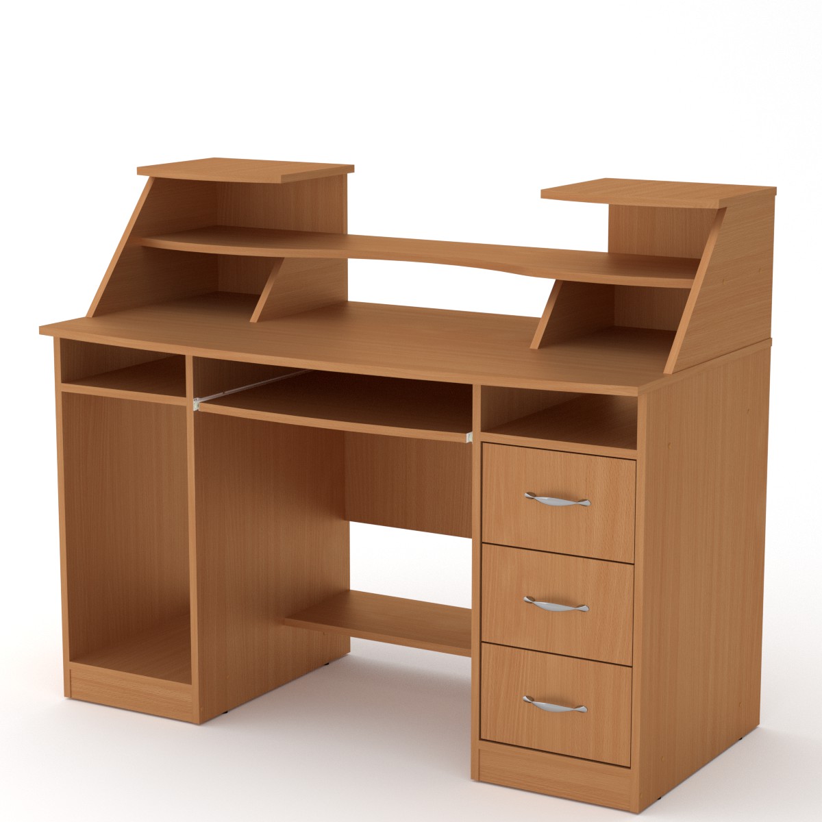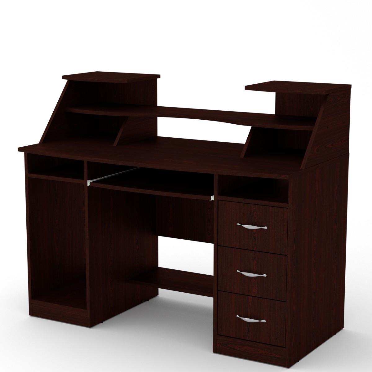 Стол состоит из ниши под системный блок, выкатной панели под клавиатуру, трёх выдвижных ящиков и двух небольших ниш под столешницей. Оригинальная надстройка позволяет разместить на ней монитор и аудио систему, а также другую сопутствующую технику.