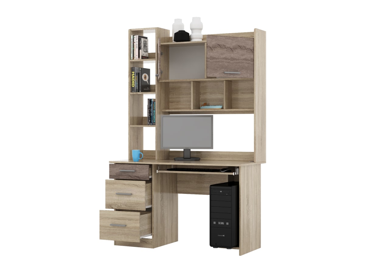 Компьютерный стол Школьник-6 производителя Эверест - идеальный вариант для комнаты подростка, также актуальным будет для использования в офисе или для домашнего кабинета. Несмотря на свои небольшие габаритные размеры, данная модель достаточно функциональная. Есть ниша для системного блока, полка под клавиатуру, три выдвижных ящика для документов, тетрадей, канцелярии. Сверху предусмотрена надстройка, которая вмещает в себя открытые полки и закрытое отделение на откидной двери. Стол смотрится очень оригинально, станет изюминкой любого интеръера.