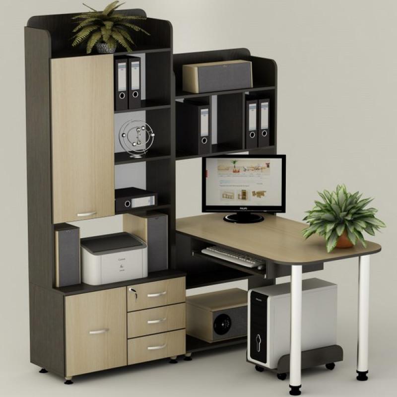 Компьютерный стол СК-17 Престиж производителя Тиса-мебель - это полноценная рабочая зона для офиса или домашнего кабинета. Многофункциональная угловая модель СК-17 имеет прямоугольную столешницу с закругленными углами, опорой выступают две металлические хромированные трубы. Есть выдвижня полка под клавиатуру. Слева предусмотрен пенал, который представляет собой тумбу с тремя выдвижными ящиками, однодверный отдел с полочками, открытые полочки. Надстройка над столом представлена открытыми полками. Производитель предлагает большой выбор цветовых решений.