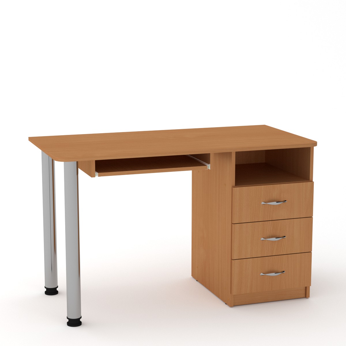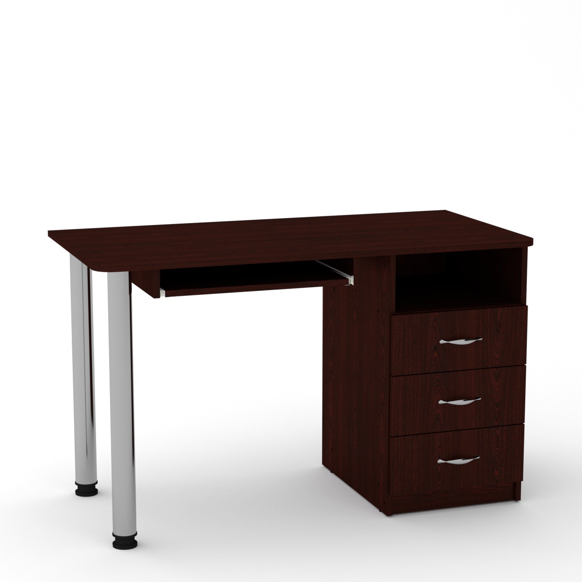 Компьютерный стол СКМ-9 производителя Компанит - элегантная и лаконичная модель, состоящая из ниши, трёх выдвижных ящиков и выдвижной полки под клавиатуру. С одной стороны столешница стола расположена на двух элегантных металлических ножках.