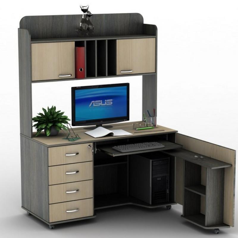 Компьютерный стол СУ-16 Универсал производителя Тиса-мебель - отличное решение как для комнаты подростка, так и для офиса. Предусмотрены четыре выдвижных ящика, также под столешницей есть отдел с полочками для документов и выдвижная полка под клавиатуру. Надстройка над столом представлена открытыми нишами и двумя, симметрично расположенными отделами с дверками. Производитель предлагает большой выбор цветовых решений.