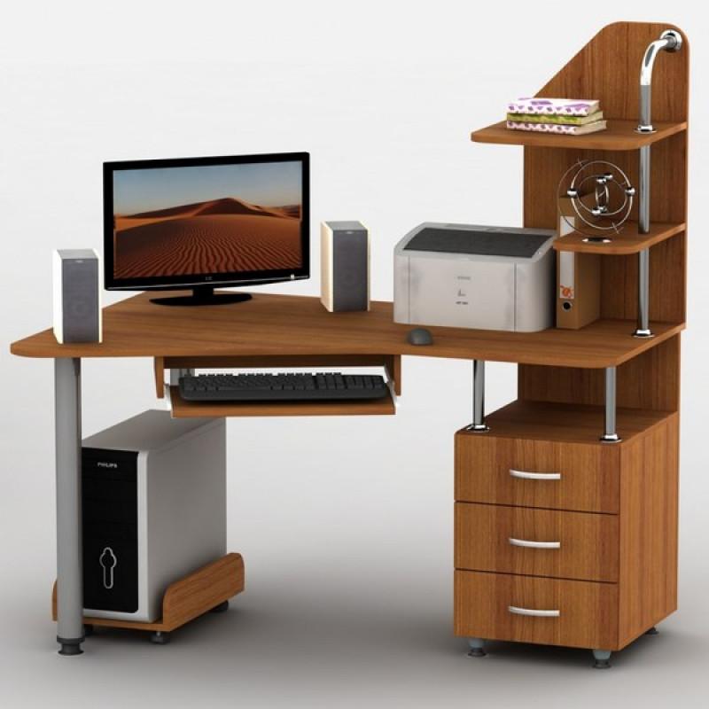 Компьютерный стол Тиса-07 производителя Тиса-мебель - идеальное решение для дома и офиса. В плане имеет угловую форму. Это достаточно функциональная модель, работать за которой одно удовольствие. Есть выдвижная полка для клавиатуры, ниша для системного блока. Также предусмотрена тумба с тремя выдвижными ящиками, в которых можно хранить тетради, книги и другие канцелярские принадлежности. Надстройка представлена конструкцией с опорой на хромированной трубе и состоит из открытых полок.
