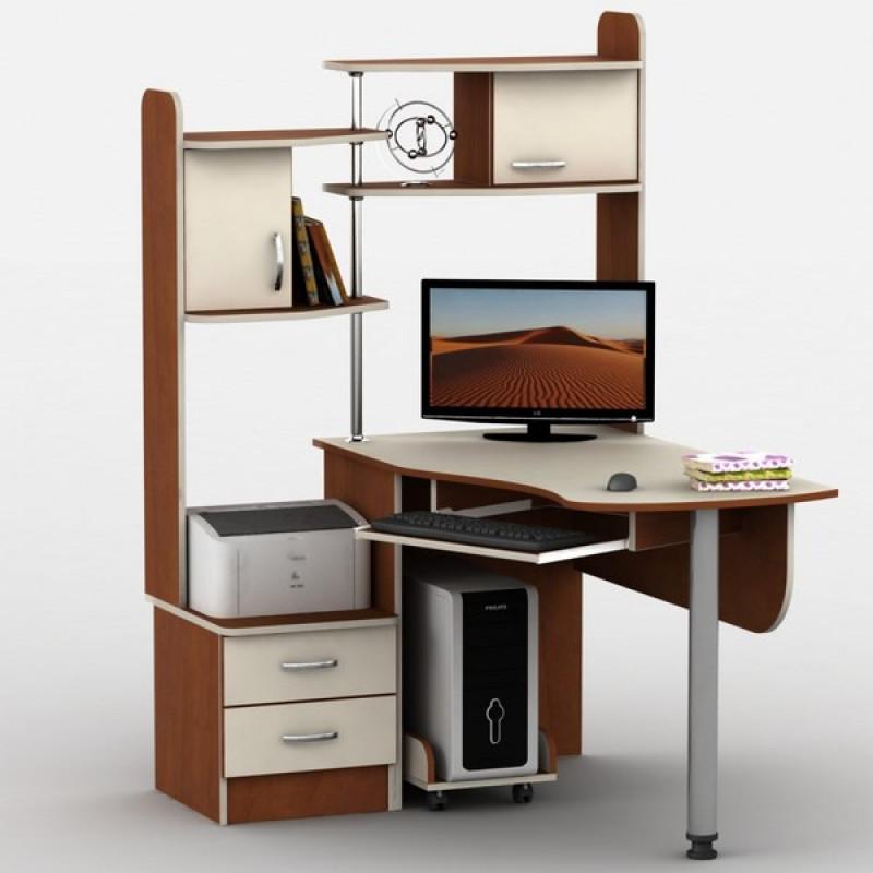 Компьютерный стол Тиса-10 производителя Тиса-мебель - идеальное решение для дома и офиса. В плане имеет угловую форму. Это достаточно функциональная модель, работать за которой одно удовольствие. Есть выдвижная полка для клавиатуры, ниша для системного блока. Также предусмотрена тумба с двумя выдвижными ящиками, в которых можно хранить тетради, книги и другие канцелярские принадлежности. Надстройка представлена конструкцией на металлических хромированных трубах , которая состоит из открытых полок и двух отделов с распашной дверкой.