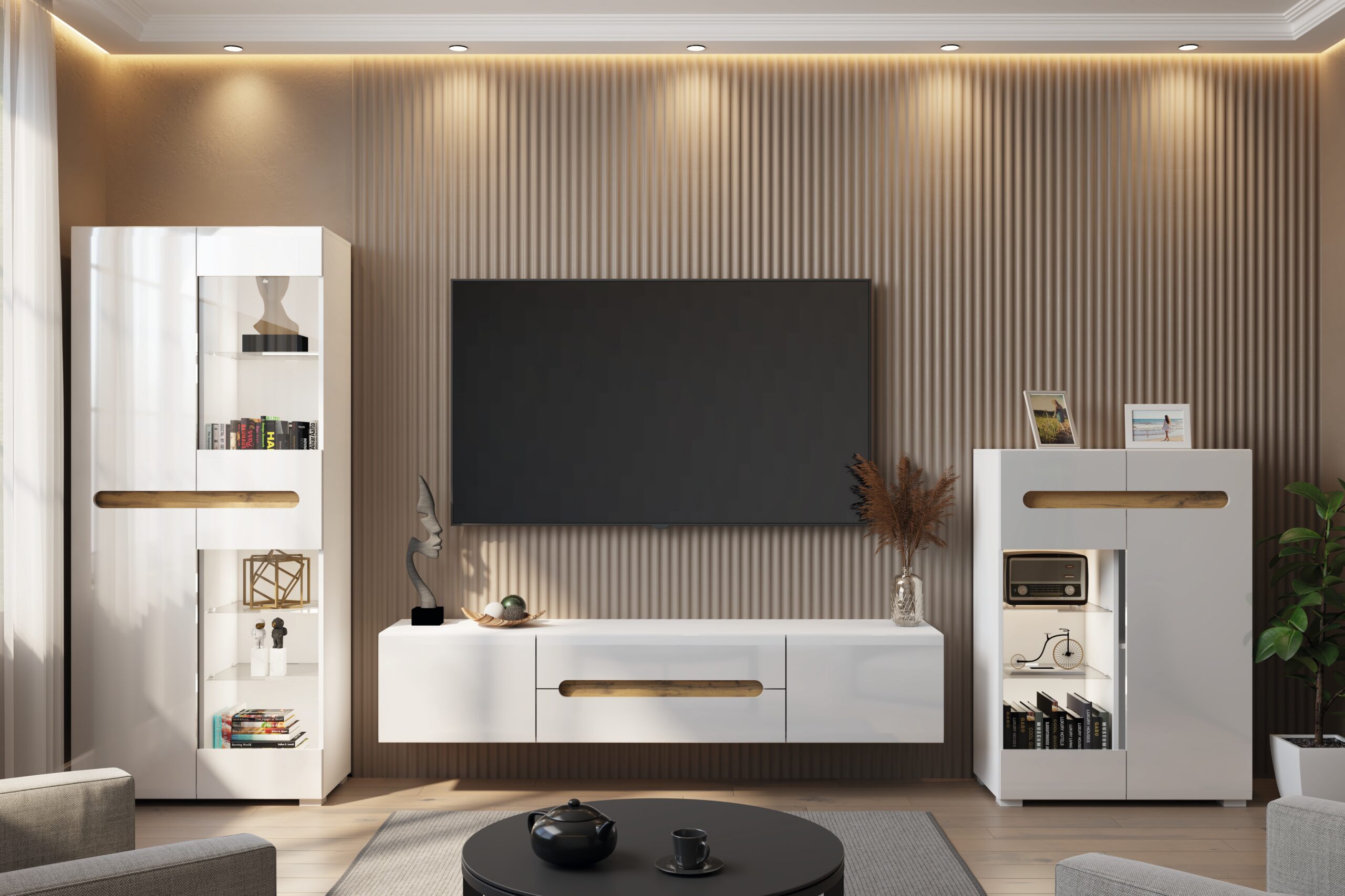 Тумба складається з двох відділень за двома дверцятами, одна з яких має вставку зі скла, зі скляними поличками, розташованими за нею.