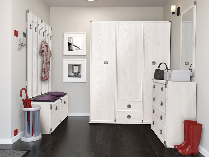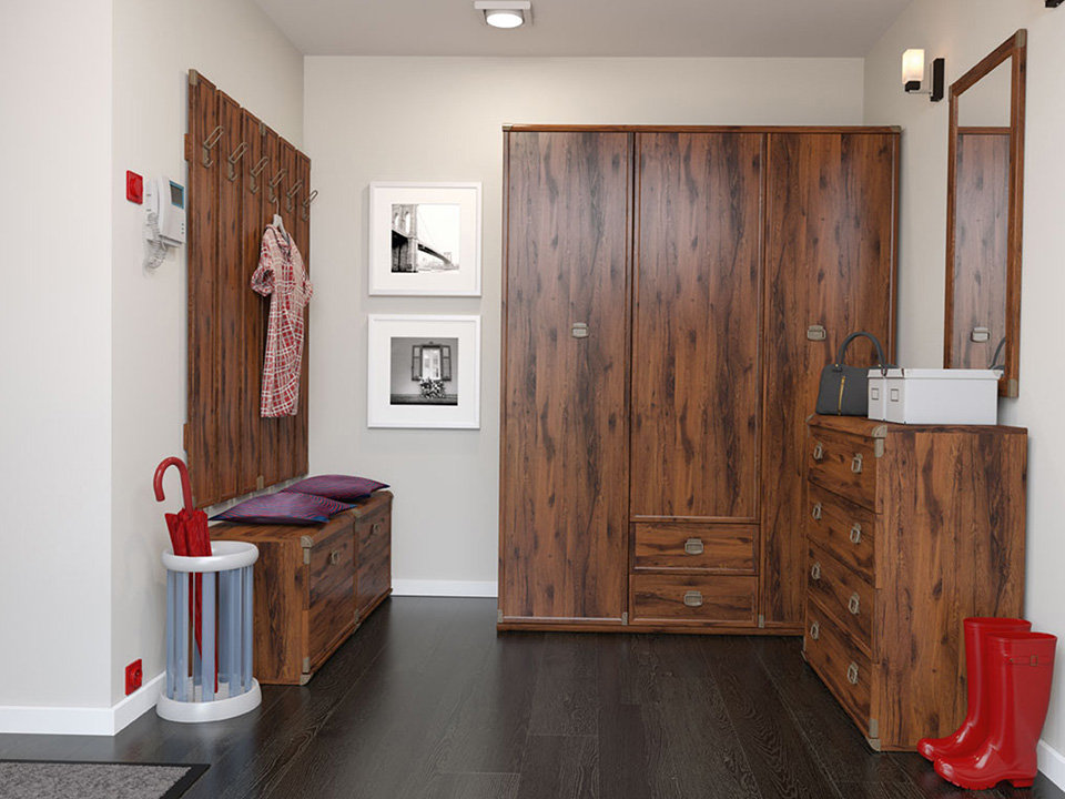Мебель Индиана представлена в цвете: дуб шуттер и сосна каньон. Характеризуется интересным дизайном, имитирующим состарившееся отполированное дерево, оригинальной формой ручек и закругленными металлическими краями верхних и нижних углов.