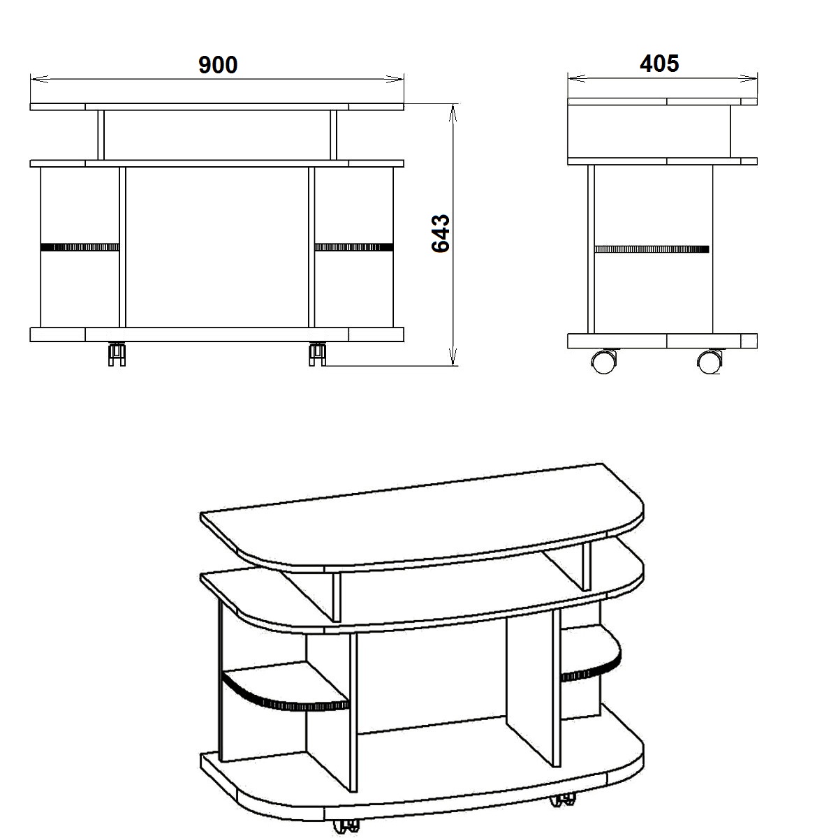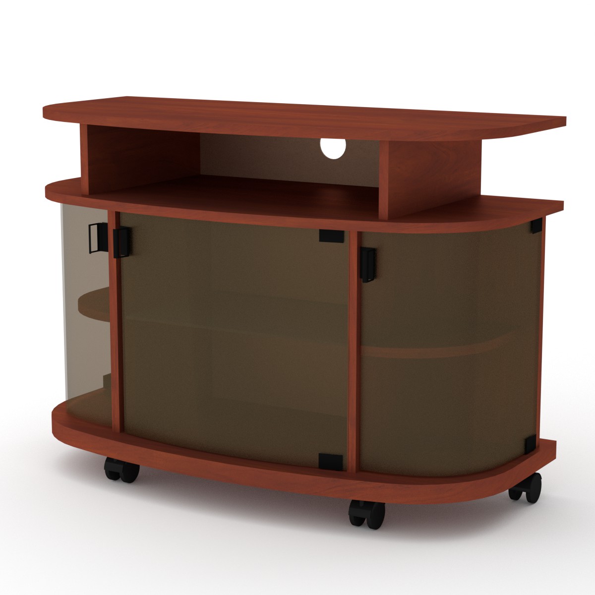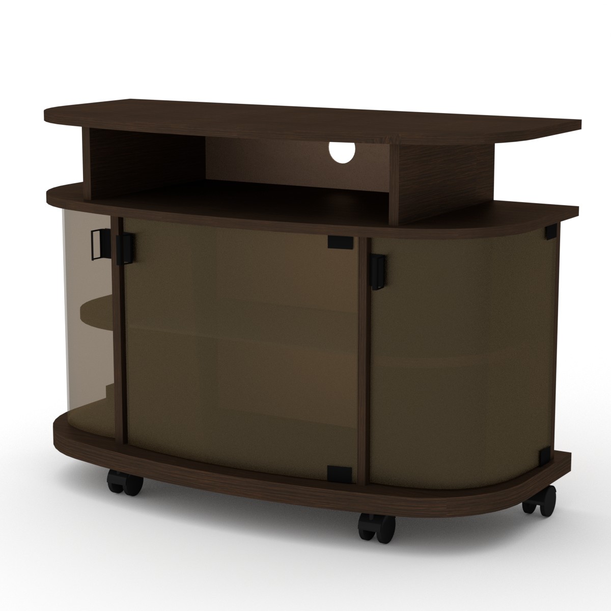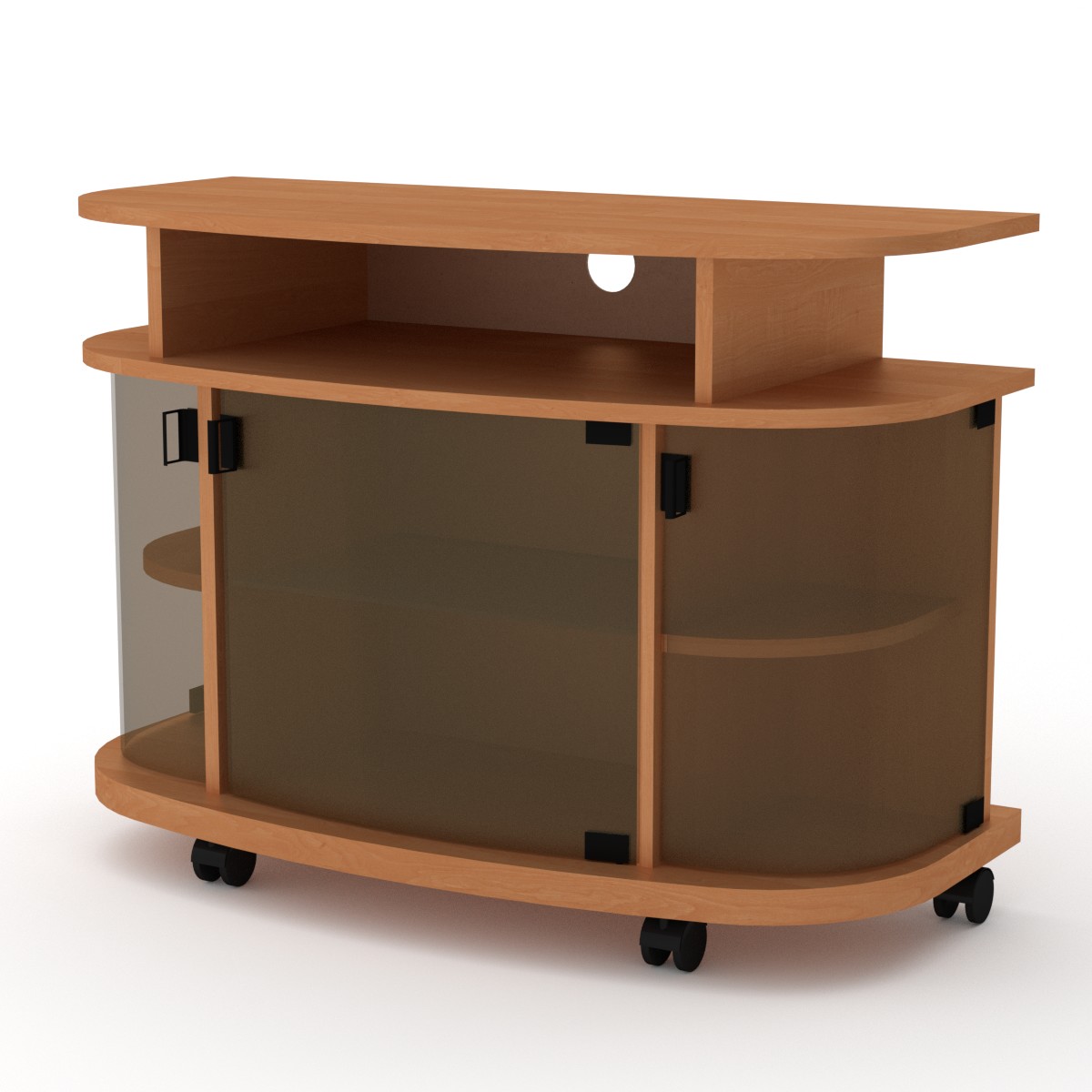 Тумба состоит из ниши под аудио-видео технику, рядом с которой расположены полочки, на которые можно ложить пульты или другие мелкие вещи, а также трёх отделов с полками за стеклянными дверками.