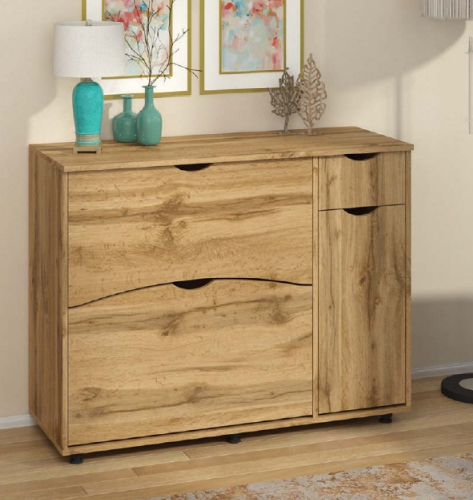 Тумба для взуття Т-4 ЕКО виробника Піхотін - ідеальне рішення для вашого передпокою. Простий і водночас красивий дизайн доповнить інтер'єр вашого будинку, наповнить його теплом та затишком. У тумбі передбачено дві відкидні полиці для взуття. Є закриті полички та висувна скринька на роликових напрямних. Тепер у вас не буде питань, де зберігати засоби для догляду за взуттям, парасольки або рукавички з рукавичками. Для зручності та гарного вигляду дизайнери передбачили замість класичних ручок виїмки у фасаді під руку.