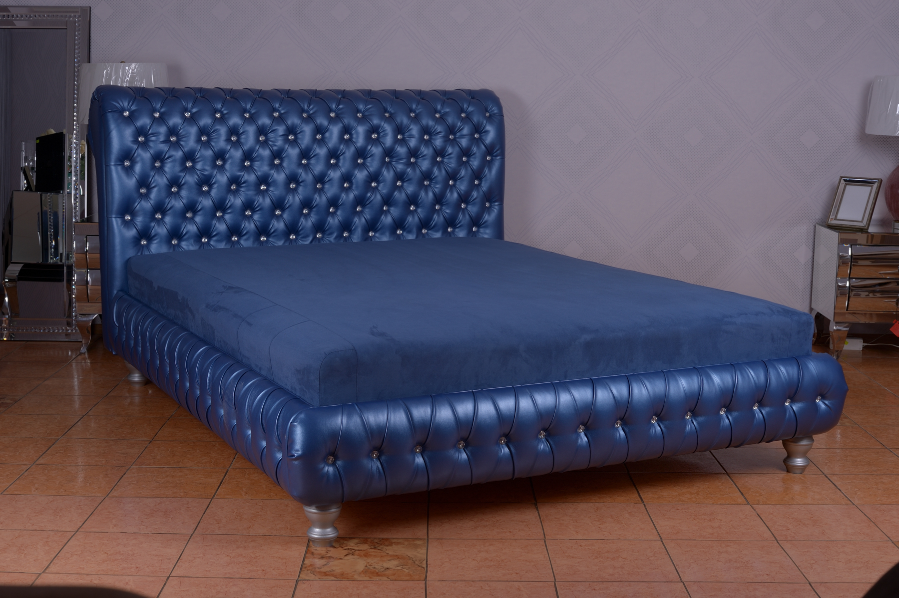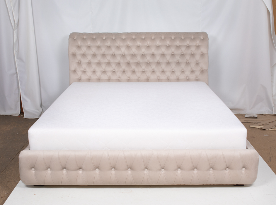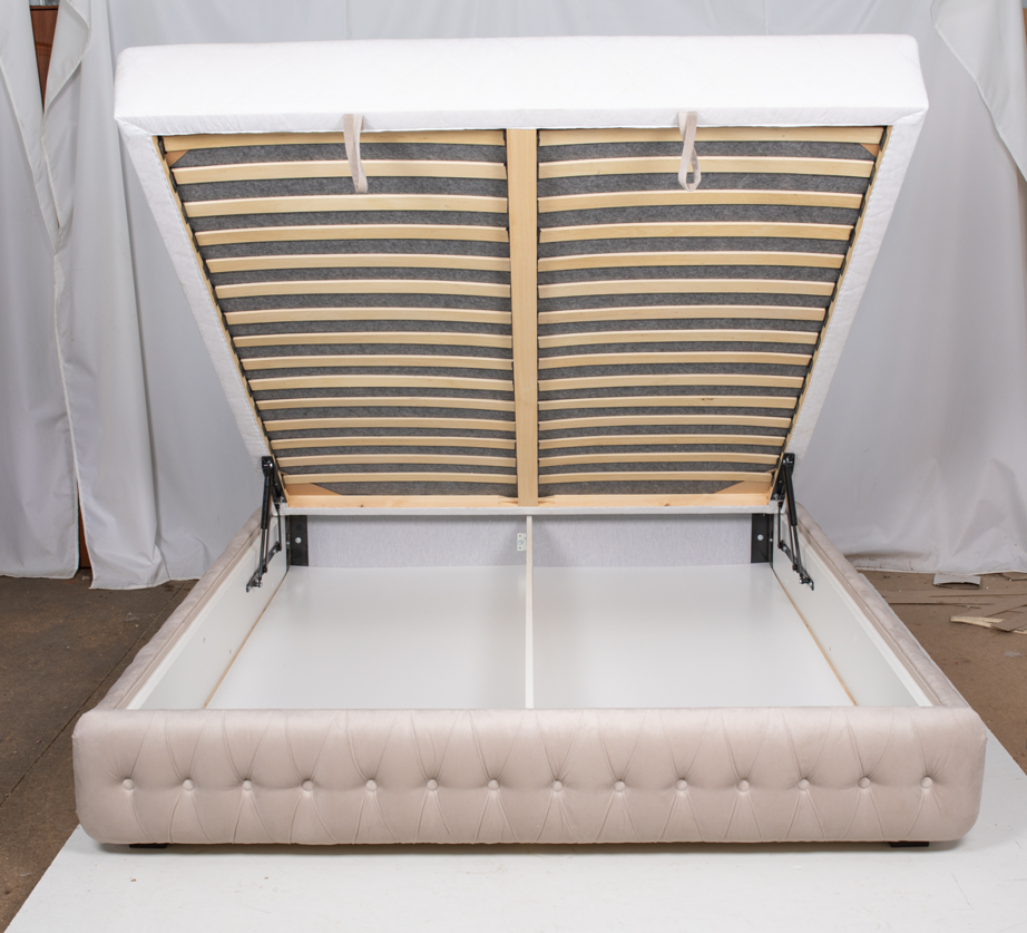 Ліжко "Фараон" №3 виробника МКС - чудовий варіант спального місця. Оригінальний та елегантний дизайн стане родзинкою кімнати. Ніжжя відсутнє, узголів'я високе, м'яке, прошите ромбами і декороване ґудзиками. Основа під матрац - ламелі, виконані в металевій рамі. Ліжко матрацом не комплектується, він купується окремо. Виробник пропонує великий вибір категорій тканини. Особливістю даної моделі є наявність підйомного механізму, таким чином отримуємо величезний ящик для білизни, що ламінує.