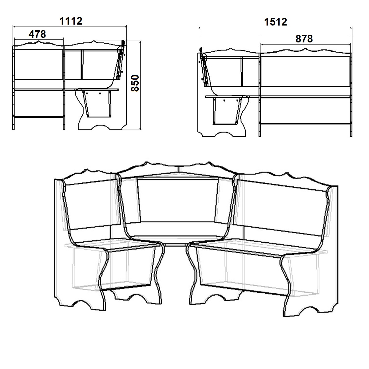 Кутник виконаний з високоякісного ламінованого ДСП, відрізняється компактністю та візерунковою формою спинки.