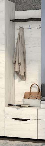 Зручна вішалка, з тумбою для взуття, з трьома гачками та полицею, входить до складу стильної модульної системи Аякс, для якої характерні: строгі елегантні форми, унікальне оформлення та наявність виїмок замість ручок на дверях та висувних ящиках.