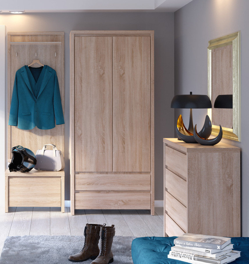 Меблі Каспіан представлені в модному кольорі дуб сонома та дуб мілано темний з яскраво вираженою текстурою дерев'яного малюнка. Характеризується простими геометричними формами та оригінальними фасадами без ручок.