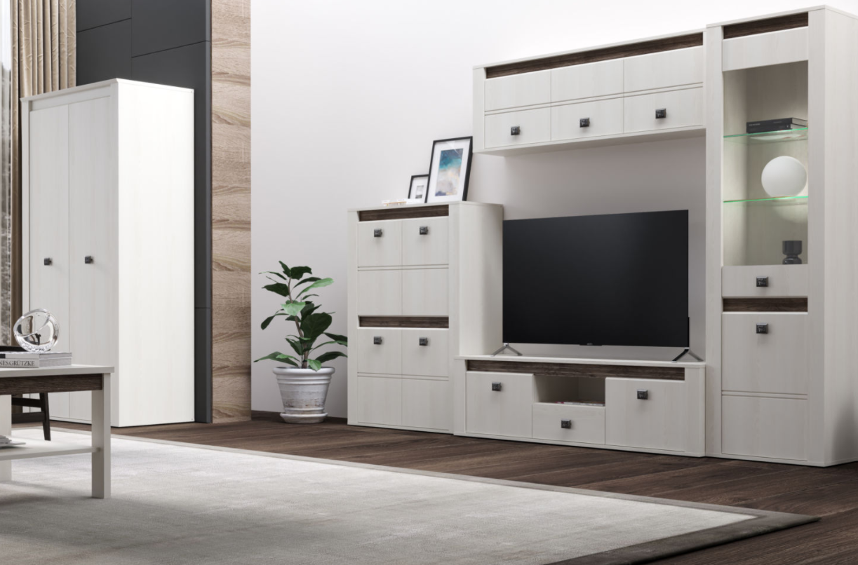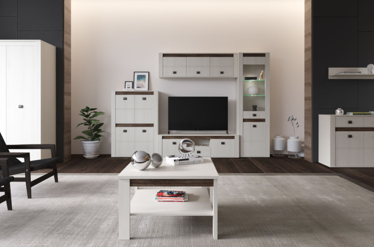 Гостиная СЕЛЕНА Гербор – комплект мебели в гостиную модульной системы Selena от фабрики Gerbor-холдинг. Изготавливается из ламинированной ДСП в эффектном цветовом сочетании ясень снежный / дуб ансберг темный. Характеризуется строгими геометрическими формами, расширенными боковыми планками, металлическими квадратными ручками SIRO с орнаментом и пластиковыми ножками EteraPlast. Стеклянные полки витрины комплектуются подсветкой. Используются шариковые направляющие полного выдвижения HAFELE и навесные петли FGV.