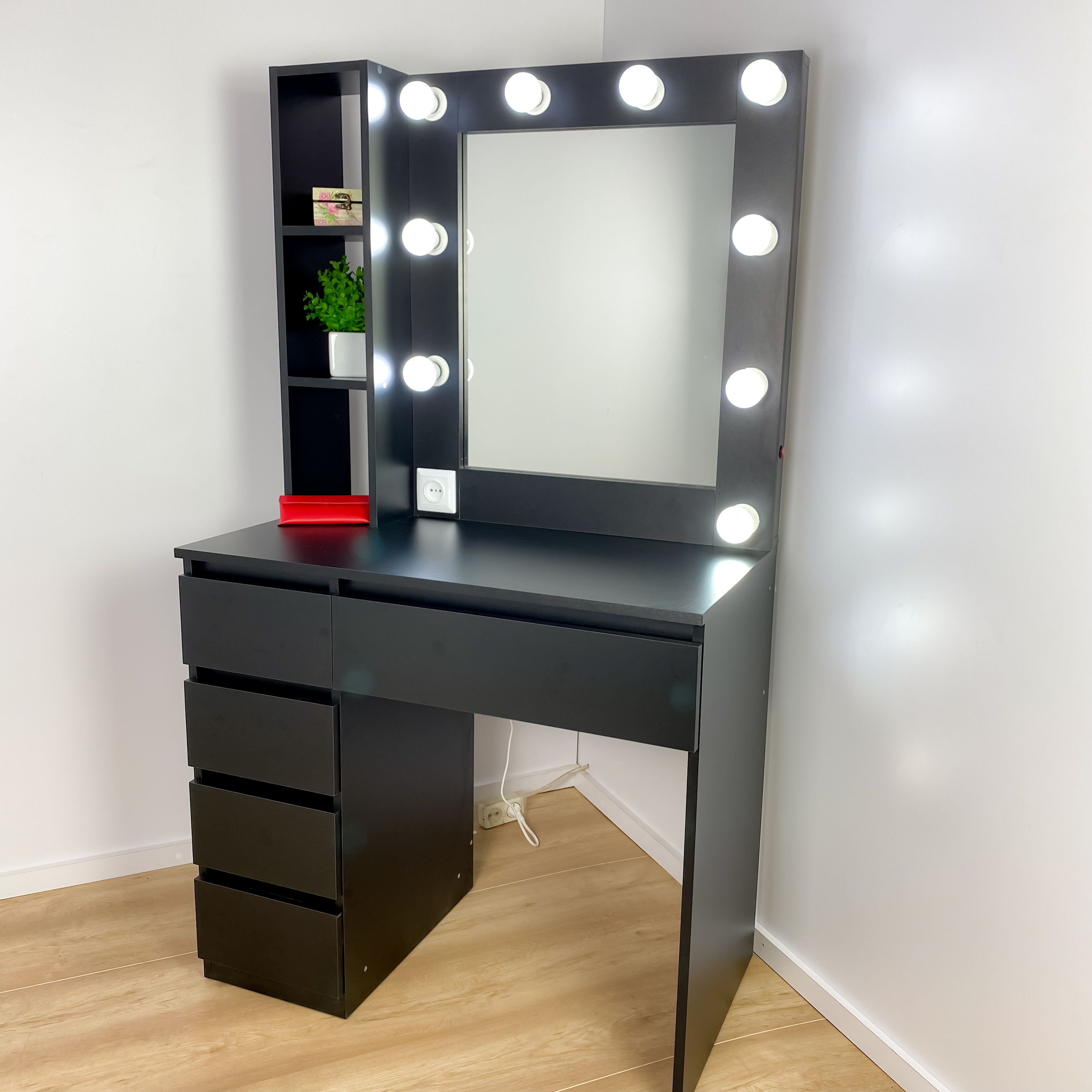Компактный столик для визажа с подсветкой и удобной рабочей поверхностью, на которой можно разместить все инструменты и средства. Ящики открываются за фасад. Удобная модель, которая идеально подойдет как для салона, так и для дома.