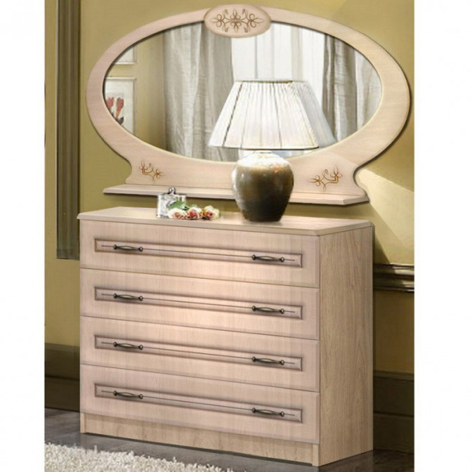 Зеркало «Василиса» отличается мягкостью и пластикой линий в стиле ренесанс, эргономичностью конструкции и невероятно красивым декором. Оно имеет оригинальную форму овала, его можно закрепить на столешнице комода или туалетного столика.